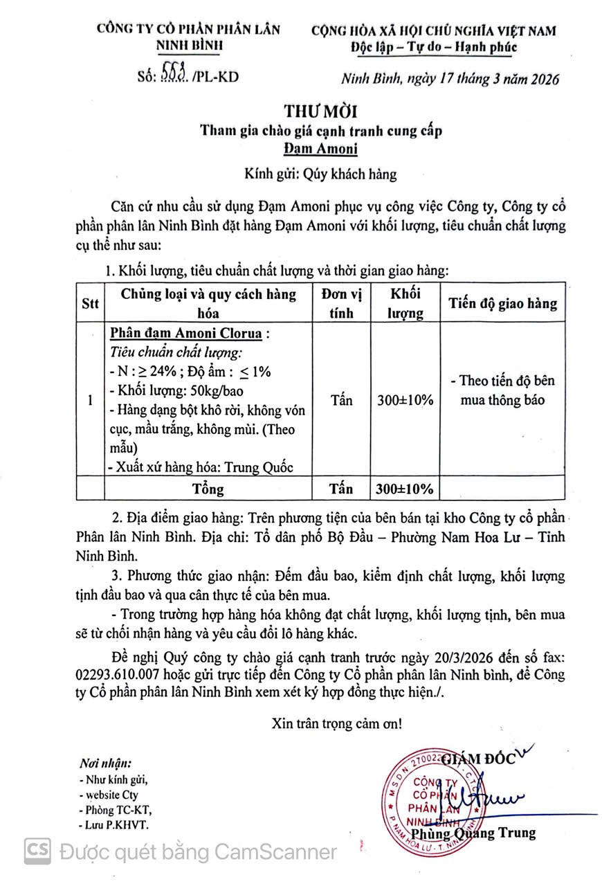 Thư mời tham gia Chào giá cạnh tranh cung cấp Đạm Amoni