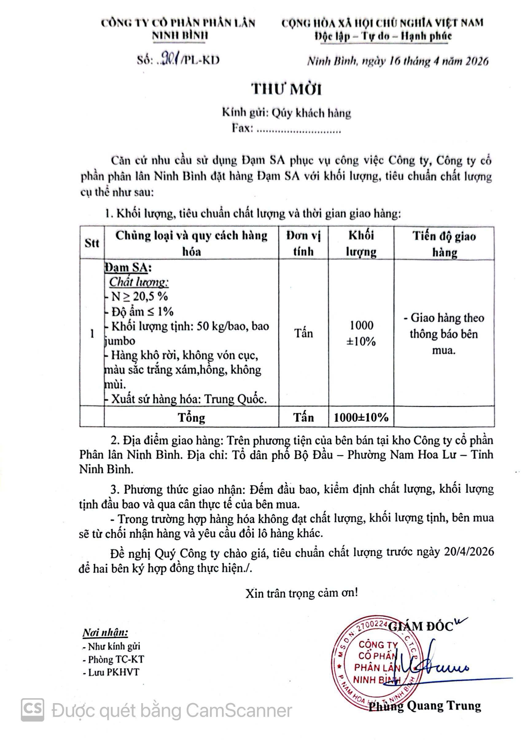 Thư mời tham gia Chào giá cạnh tranh cung cấp Đạm SA